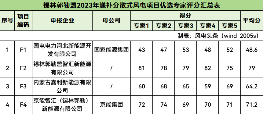 根據(jù)《錫林郭勒盟2023年遞補分散式風電項目優(yōu)選專家評分匯總表》,申報企業(yè)分別為國電電力河北新能源開發(fā)有限公司、錫林郭勒盟智匯新能源有限公司、內(nèi)蒙古嘉利新能源有限公司、京能智匯(錫林郭勒)新能源有限公司。