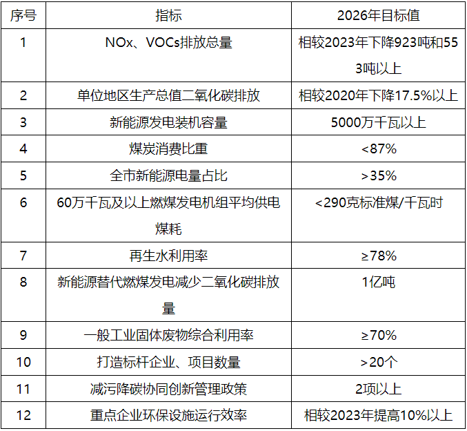 2026年,減污降碳協(xié)同能力顯著提升,建立以重點企業(yè)信息臺賬為基礎的污染物和碳排放協(xié)同管理機制,重點領域形成減污降碳協(xié)同技術清單和一批典型案例,減污降碳協(xié)同度有效提升,充分體現(xiàn)減污降碳協(xié)同創(chuàng)新對綠色低碳轉(zhuǎn)型發(fā)展的促進作用。打造10個以上減污降碳協(xié)同增效標桿企業(yè)或標桿項目,新能源發(fā)電裝機容量達到5000萬千瓦以上,重點企業(yè)環(huán)保設施運行效率相較2023年提高10%以上,當年全市NOx、VOCs排放總量分別下降423噸、253噸以上,單位地區(qū)生產(chǎn)總值二氧化碳排放相較2020年下降17.5%以上。