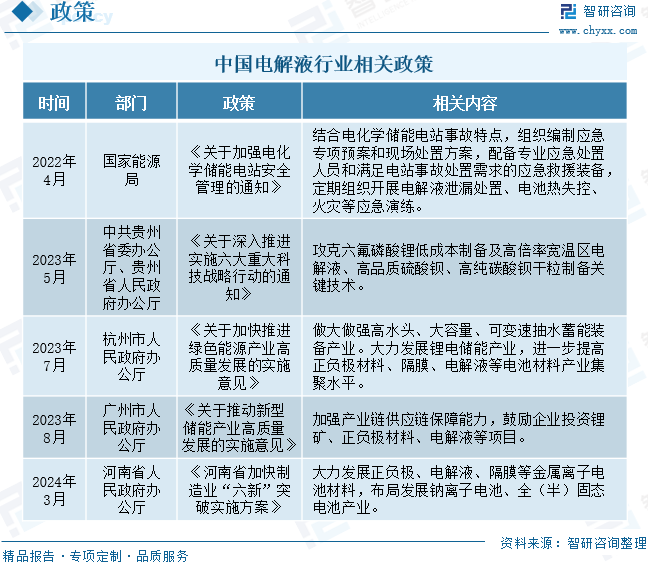 近年來,中國(guó)加快出臺(tái)電解液行業(yè)相關(guān)政策,以推動(dòng)電解液行業(yè)的健康發(fā)展。2022年4月,國(guó)家能源局印發(fā)《關(guān)于加強(qiáng)電化學(xué)儲(chǔ)能電站安全管理的通知》,提出要結(jié)合電化學(xué)儲(chǔ)能電站事故特點(diǎn),組織編制應(yīng)急專項(xiàng)預(yù)案和現(xiàn)場(chǎng)處置方案,配備專業(yè)應(yīng)急處置人員和滿足電站事故處置需求的應(yīng)急救援裝備,定期組織開展電解液泄漏處置、電池?zé)崾Э亍⒒馂?zāi)等應(yīng)急演練。2024年3月,河南省人民政府辦公廳印發(fā)《河南省加快制造業(yè)“六新”突破實(shí)施方案》,提出要大力發(fā)展正負(fù)極、電解液、隔膜等金屬離子電池材料,布局發(fā)展鈉離子電池、全(半)固態(tài)電池產(chǎn)業(yè)。