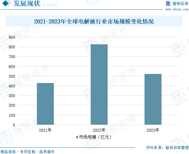 電解液是鋰離子電池的四大主要組成部分之一,是實(shí)現(xiàn)鋰離子在正負(fù)極遷移的媒介,對(duì)鋰電容量、工作溫度、循環(huán)效率以及安全性都有重要影響。2022年全球電解液市場(chǎng)規(guī)模達(dá)到824.20億元,同比增長(zhǎng)92.39%。統(tǒng)計(jì)數(shù)據(jù)顯示,2023年全球電解液市場(chǎng)規(guī)模為522.1億元,同比下滑36.7%,主要原因在于電解液價(jià)格的下滑。
