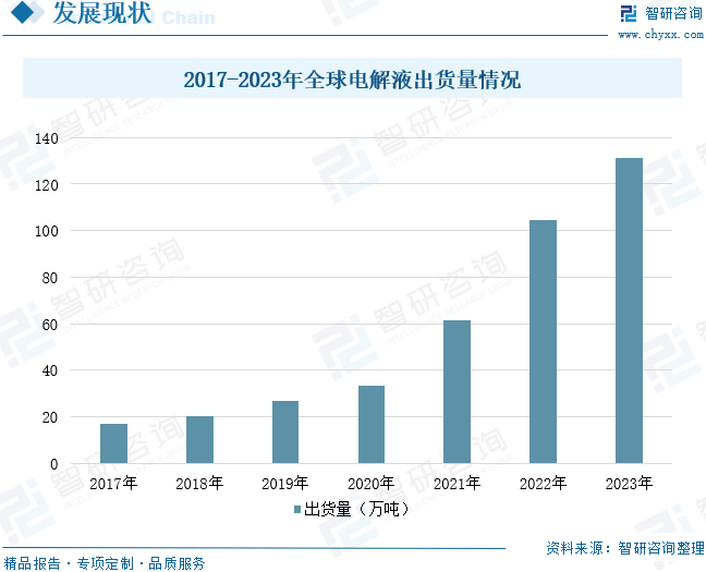 通常電解液占電池重量和體積的比重分別為15%、32%,其對(duì)純度及雜質(zhì)的含量要求非常高,生產(chǎn)過程中需要高純的原料以及必要的提純工藝。2017年至2022年全球電解液出貨量由16.7萬噸增長(zhǎng)至104.3萬噸,2023年全球電解液出貨量約為131.26萬噸。