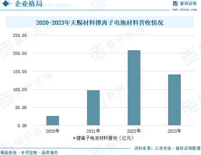 廣州天賜高新材料股份有限公司主營(yíng)業(yè)務(wù)為精細(xì)化工新材料的研發(fā)、生產(chǎn)和銷售,屬于精細(xì)化工行業(yè),主要產(chǎn)品為鋰離子電池材料、日化材料及特種化學(xué)品。公司生產(chǎn)的鋰離子電池材料主要為鋰離子電池電解液和正極材料磷酸鐵鋰,均為鋰離子電池關(guān)鍵原材料。同時(shí),圍繞主要產(chǎn)品,公司還配套布局電解液和磷酸鐵鋰關(guān)鍵原料的生產(chǎn)能力,包括六氟磷酸鋰、新型電解質(zhì)、添加劑、磷酸鐵、碳酸鋰加工以及鋰輝石精礦等。電解液和正極材料磷酸鐵鋰用于生產(chǎn)鋰離子電池,鋰離子電池在新能源汽車、消費(fèi)電子產(chǎn)品和儲(chǔ)能領(lǐng)域均有廣泛應(yīng)用。數(shù)據(jù)顯示,2023年天賜材料鋰離子電池材料營(yíng)收為141.04億元。