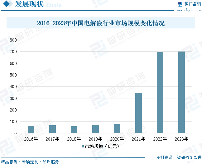 近年來,隨著全球及國(guó)內(nèi)新能源汽車和鋰電池行業(yè)快速發(fā)展,國(guó)內(nèi)在電解液材料方面已具備一定的產(chǎn)能和技術(shù)優(yōu)勢(shì),也使得我國(guó)電解液市場(chǎng)規(guī)模不斷增長(zhǎng);尤其是2021年得到迅速發(fā)展。數(shù)據(jù)顯示,2021年,我國(guó)電解液市場(chǎng)規(guī)模迅速增長(zhǎng),約為346.53億元,同比上升355%。2023年我國(guó)電解液市場(chǎng)規(guī)模約為700億元。