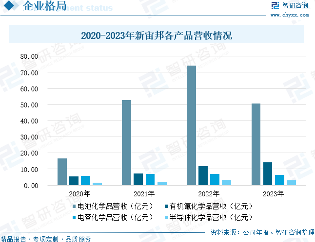 深圳新宙邦科技股份有限公司主營(yíng)業(yè)務(wù)是新型電子化學(xué)品及功能材料的研發(fā)、生產(chǎn)、銷售和服務(wù),主要產(chǎn)品包括電池化學(xué)品、有機(jī)氟化學(xué)品、電容化學(xué)品、半導(dǎo)體化學(xué)品四大系列。公司通過自主研發(fā)、產(chǎn)學(xué)研合作和上下游協(xié)同等方式,開展產(chǎn)品與技術(shù)創(chuàng)新,為客戶提供高品質(zhì)的產(chǎn)品和解決方案,并通過前沿研究持續(xù)培育公司新增長(zhǎng)點(diǎn)。經(jīng)過多年發(fā)展,公司掌握了鋰離子電池電解液及相關(guān)材料的核心生產(chǎn)技術(shù),能生產(chǎn)高質(zhì)量產(chǎn)品,為客戶提供全方位、多元化的服務(wù),在行業(yè)中享有較高的市場(chǎng)地位,與行業(yè)主要頭部客戶均建立了長(zhǎng)期穩(wěn)定的合作關(guān)系。數(shù)據(jù)顯示,2023年新宙邦電池化學(xué)品營(yíng)收為50.53億元;有機(jī)氟化學(xué)品營(yíng)收為14.25億元;電容化學(xué)品營(yíng)收為6.29億元;半導(dǎo)體化學(xué)品營(yíng)收為3.11億元。