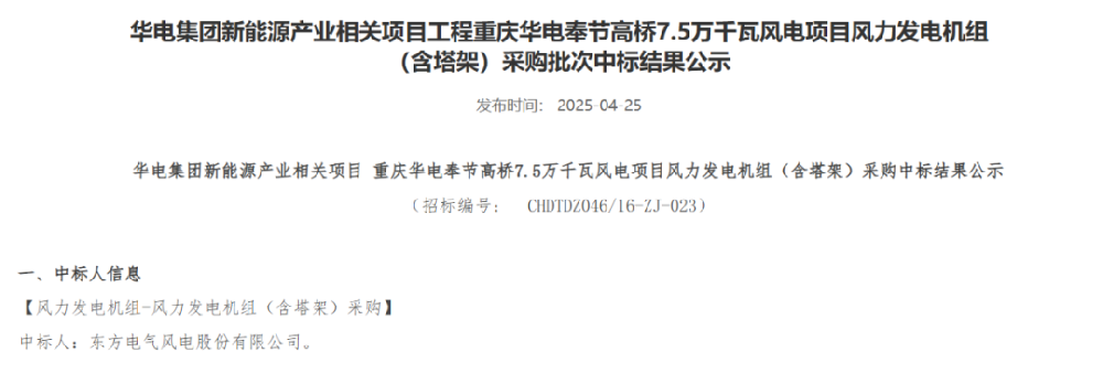 公告顯示,東方電氣風電股份有限公司成功中標該項目,中標價格為17100.000000萬元。