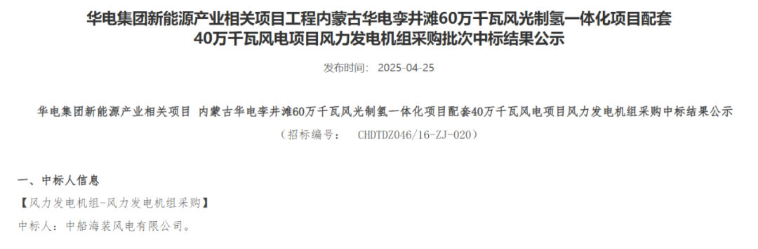 公告顯示,中船海裝風電有限公司成功中標該項目,中標價格為55069.920000萬元。