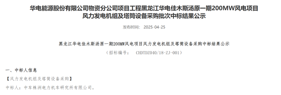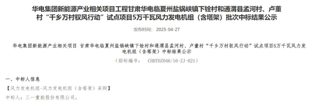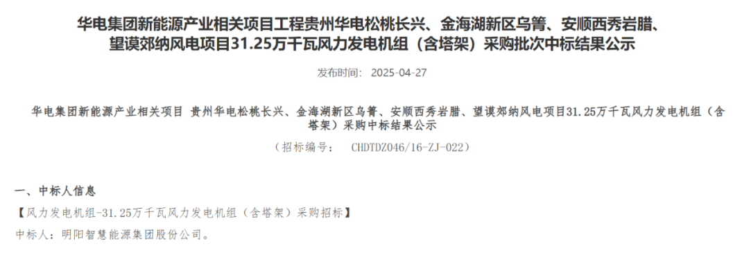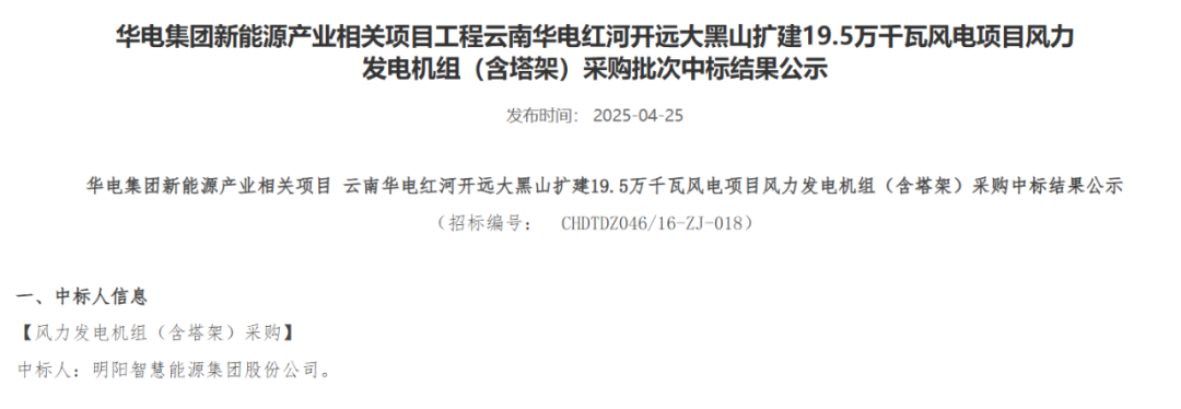 近日,華電集團電子商務平臺發(fā)布重慶華電奉節(jié)高橋7.5萬千瓦風電項目、黑龍江華電佳木斯湯原一期200MW風電項目、內(nèi)蒙古華電孿井灘60萬千瓦風光制氫一體化項目配套40萬千瓦風電項目、云南華電紅河開遠大黑山擴建19.5萬千瓦風電項目、黑龍江華電黑河北安建華20萬千瓦風電項目、貴州華電松桃長興、金海湖新區(qū)烏箐、安順西秀巖臘、望謨郊納風電項目31.25萬千瓦、甘肅華電臨夏州鹽鍋峽鎮(zhèn)下銓村和通渭縣孟河村、盧董村“千鄉(xiāng)萬村馭風行動”試點項目5萬千瓦風力發(fā)電機組采購中標結(jié)果公示的公告。