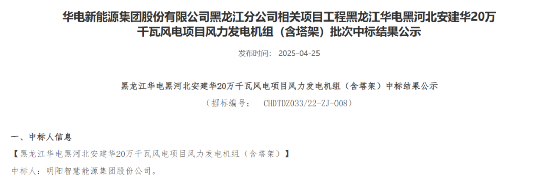 公告顯示,明陽智慧能源集團股份公司成功中標該項目,中標價格為70750.000000萬元。