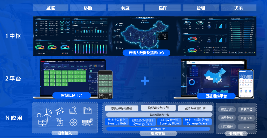 三一重能基于物聯(lián)網(wǎng)、大數(shù)據(jù)、人工智能等先進(jìn)信息化技術(shù),構(gòu)建了“1中樞、2平臺、N應(yīng)用”的數(shù)字化場站管理模式,實現(xiàn)風(fēng)場區(qū)域全場景的智慧化管理。依靠風(fēng)機診斷與故障預(yù)警模型,對機組實時進(jìn)行健康診斷,實現(xiàn)對故障的提前預(yù)判,通過“預(yù)測、預(yù)警、預(yù)檢、預(yù)修”的預(yù)防性運維舉措,減少計劃外停機時長及次數(shù),降低發(fā)電量損失。